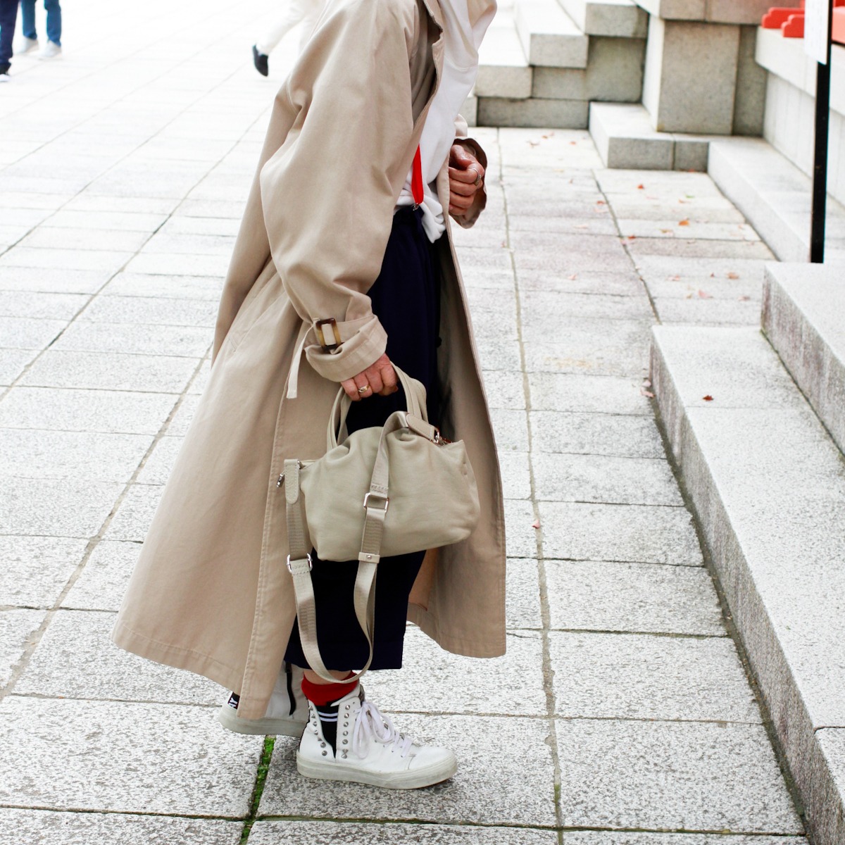今日はロングコートに合わせてみました。カジュアルなスニーカーとのバランスも◎