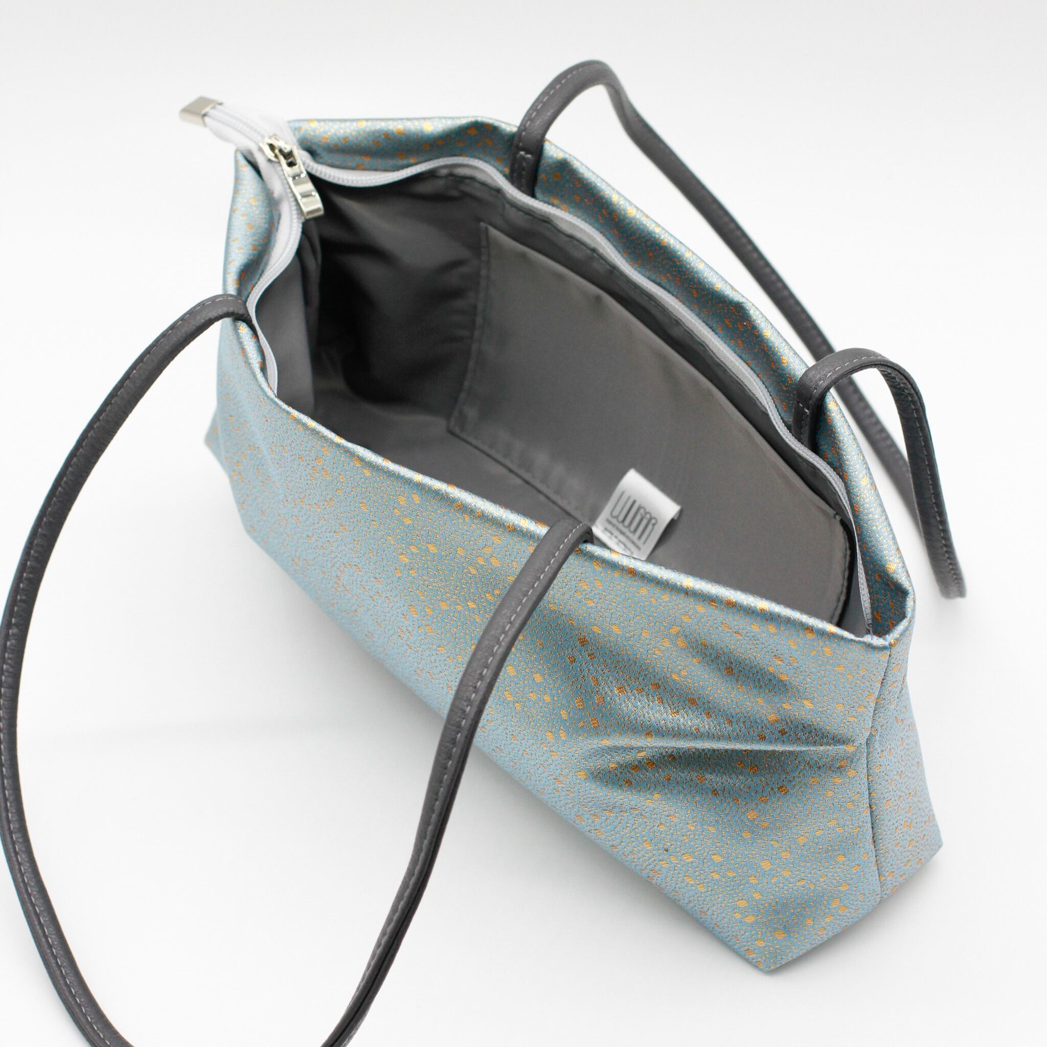 バッグのサイズ感はコンパクトでありながら、スマートフォン、お財布、ハンカチ、コスメなど、外出時に必要なアイテムがしっかり収まる実用的な設計。内側には小物が迷子にならないようポケットも備えています。
