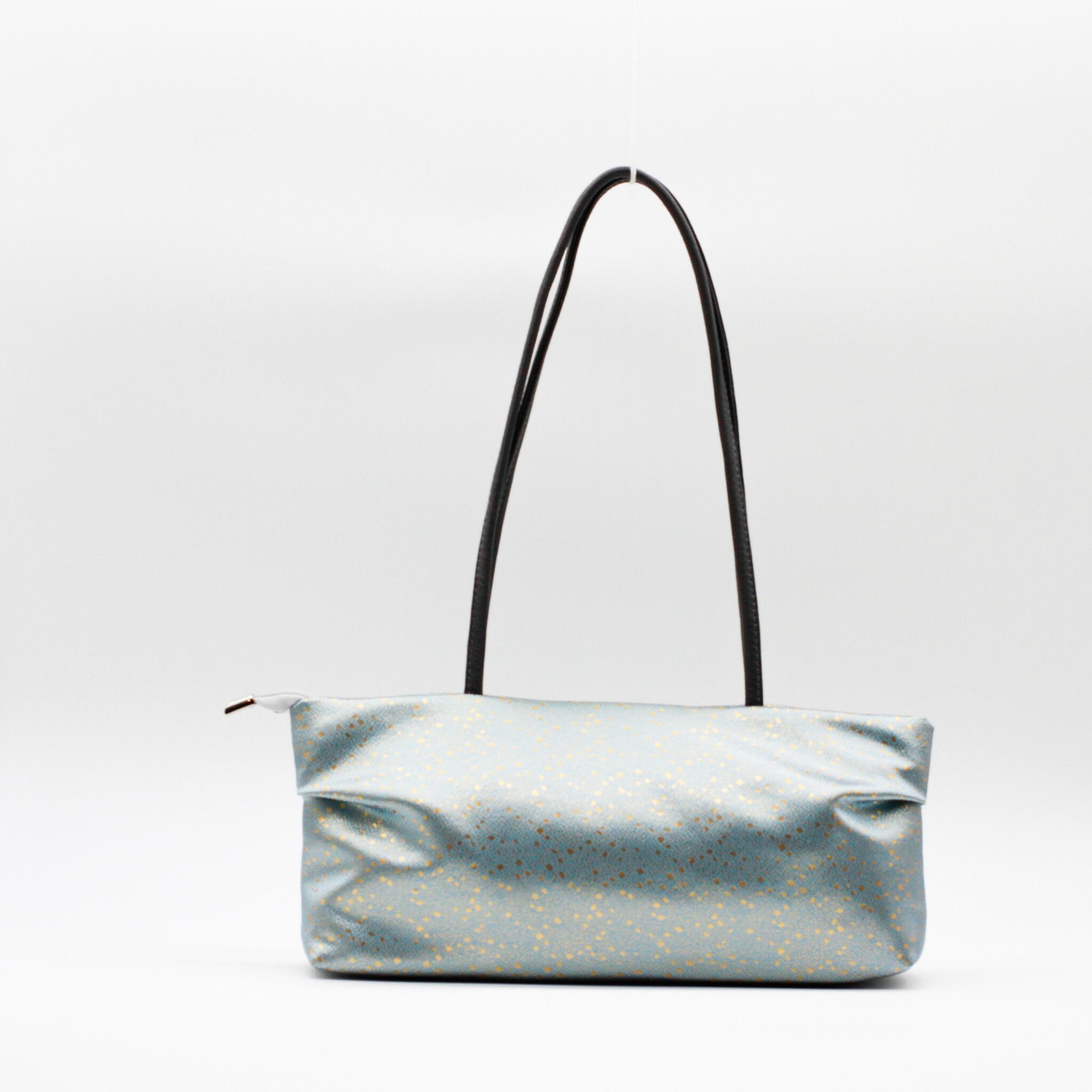 上質なシルクの艶めきと、しっかりとしたレザーの風合いが美しいコントラストを生む、横長フォルムのハンドバッグです。