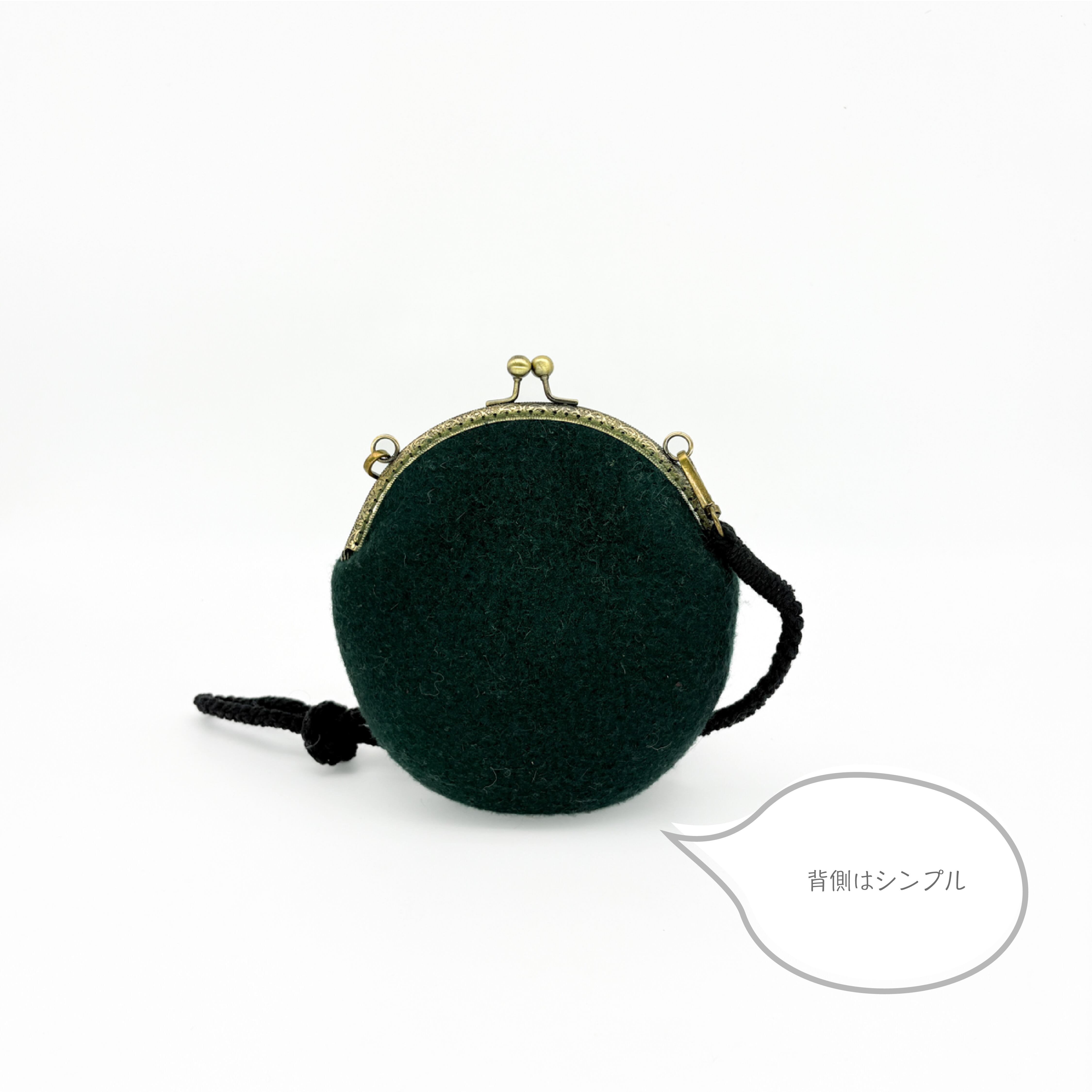 落ち着いた深い色合いのフェルトに、小さな装飾をひとつずつ重ねて仕立てたがま口ミニバッグです。