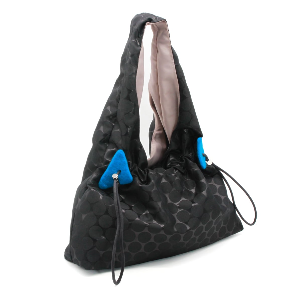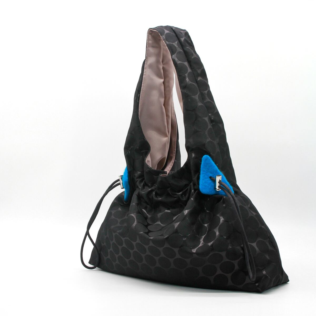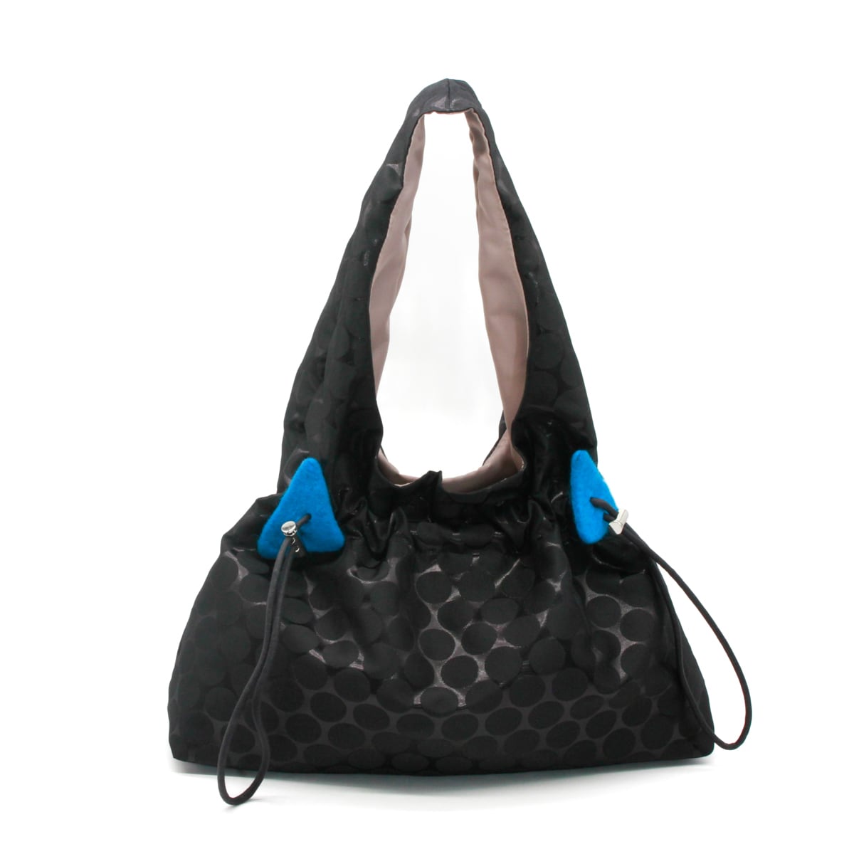 紐でギャザーを寄せることでフォルムの変化も楽しめ、その日のコーディネートや気分に合わせて印象を変えられるのがポイント。さらに、紐部分には青・赤・緑のフェルト装飾をあしらい、さりげない遊び心とアクセントを添えています。