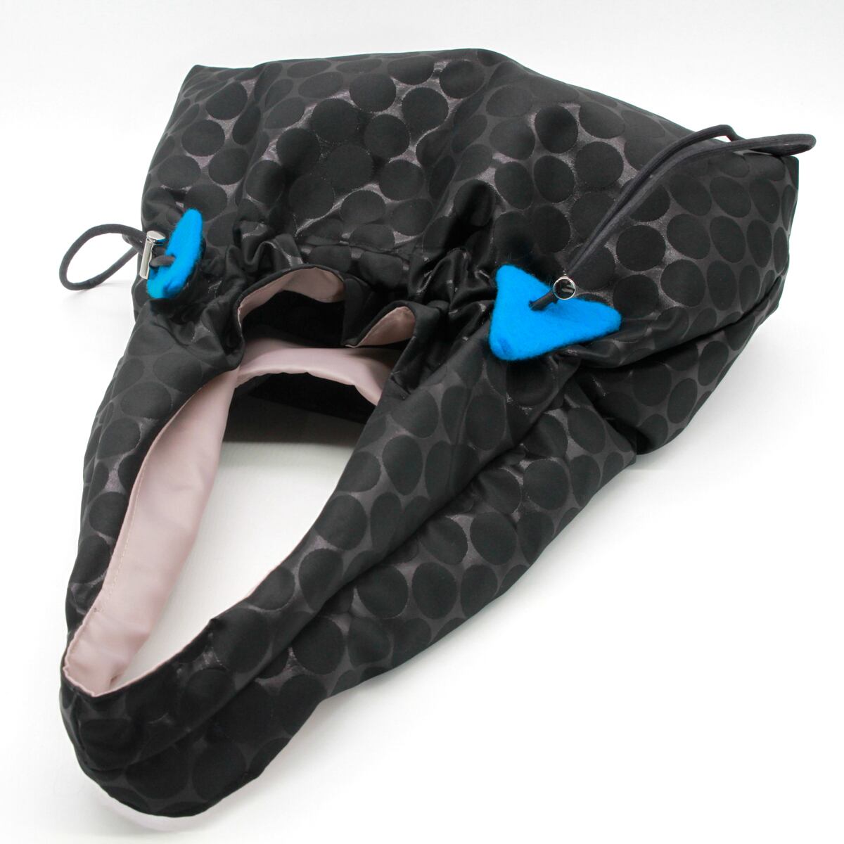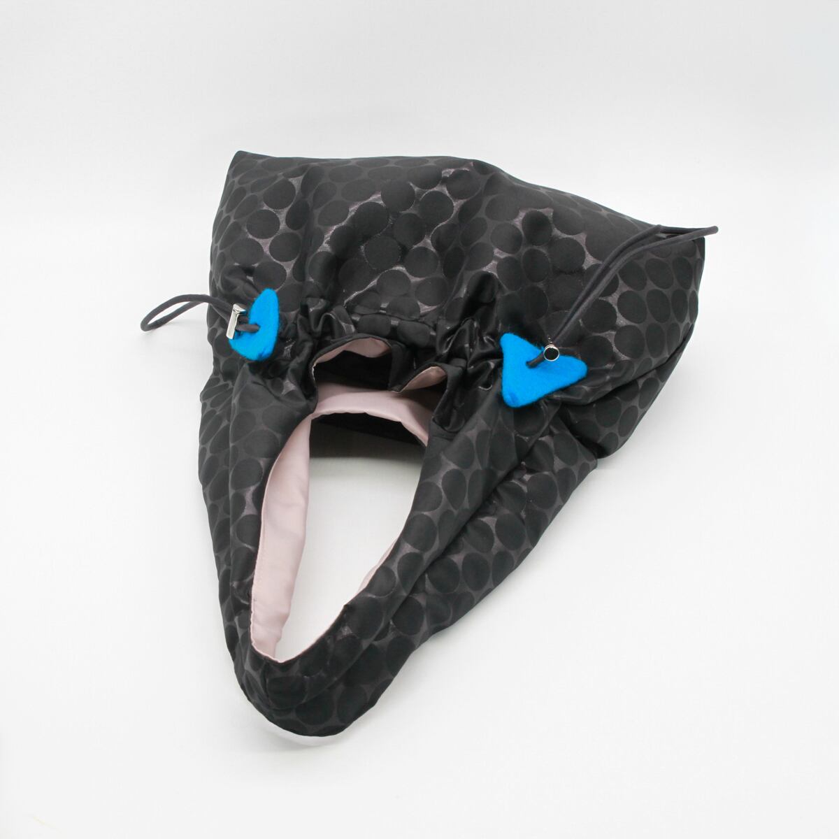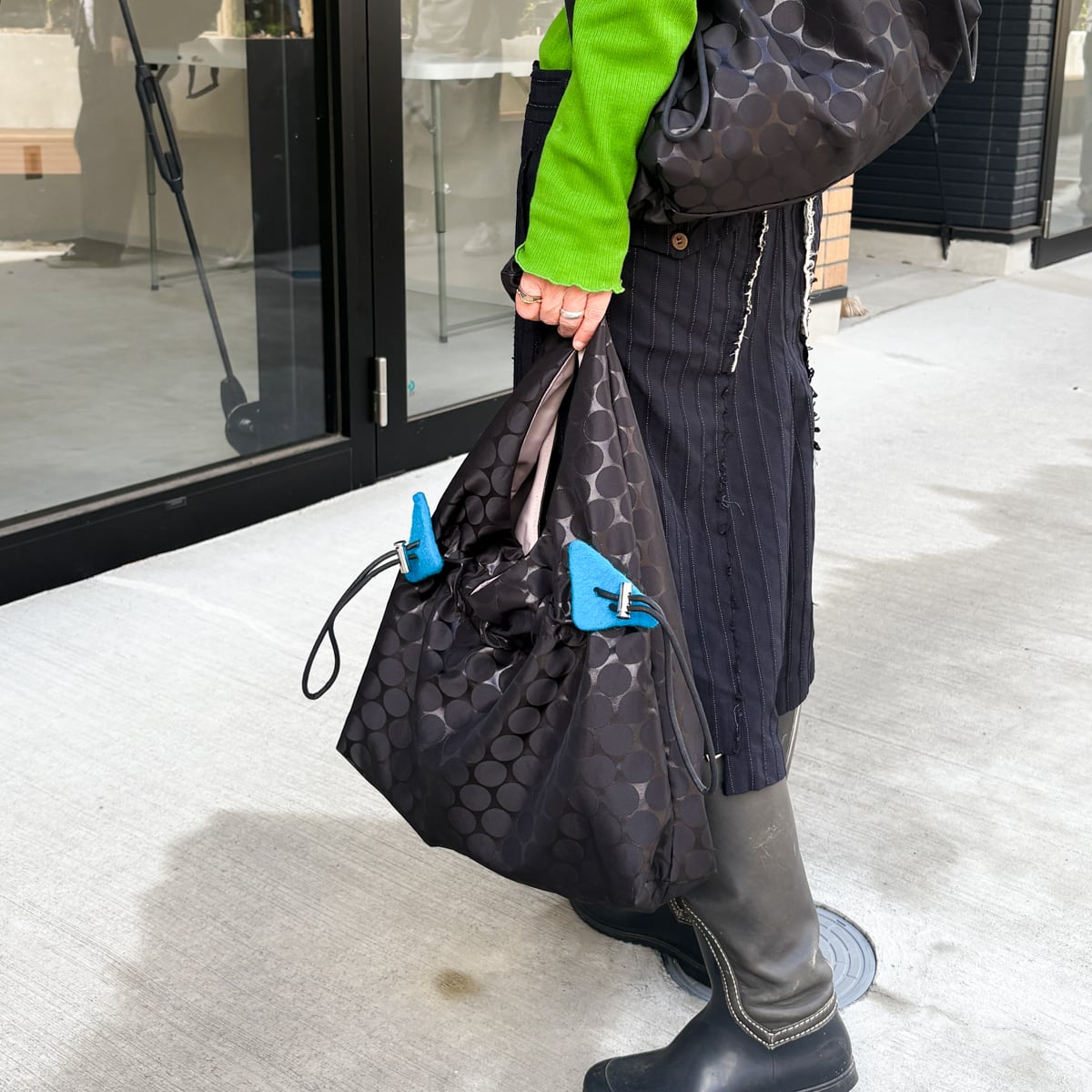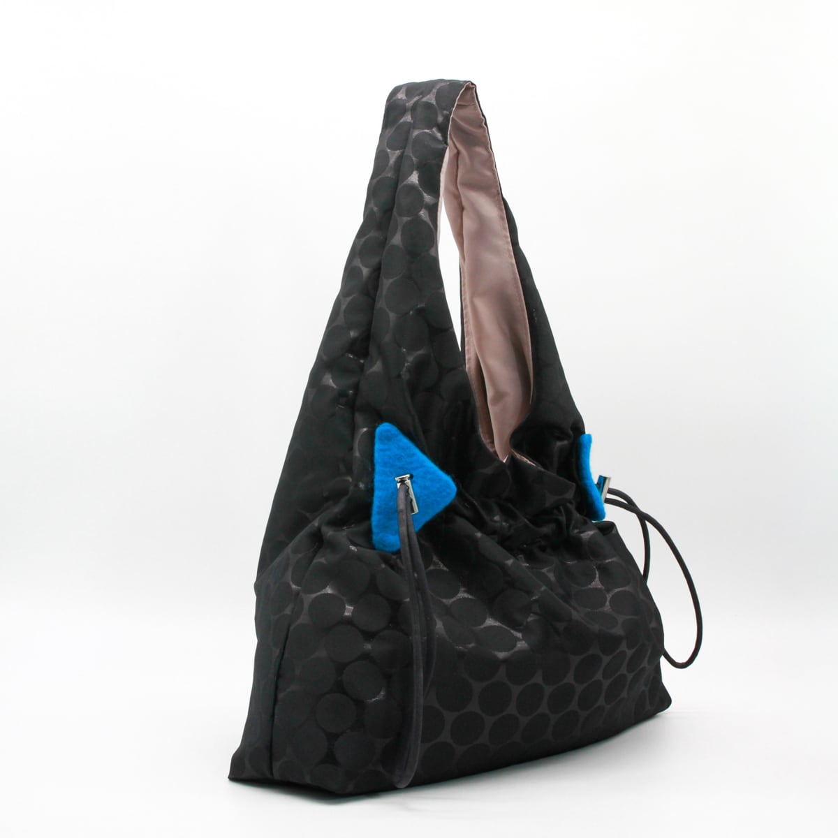紐でギャザーを寄せることでフォルムの変化も楽しめ、その日のコーディネートや気分に合わせて印象を変えられるのがポイント。さらに、紐部分には青・赤・緑のフェルト装飾をあしらい、さりげない遊び心とアクセントを添えています。