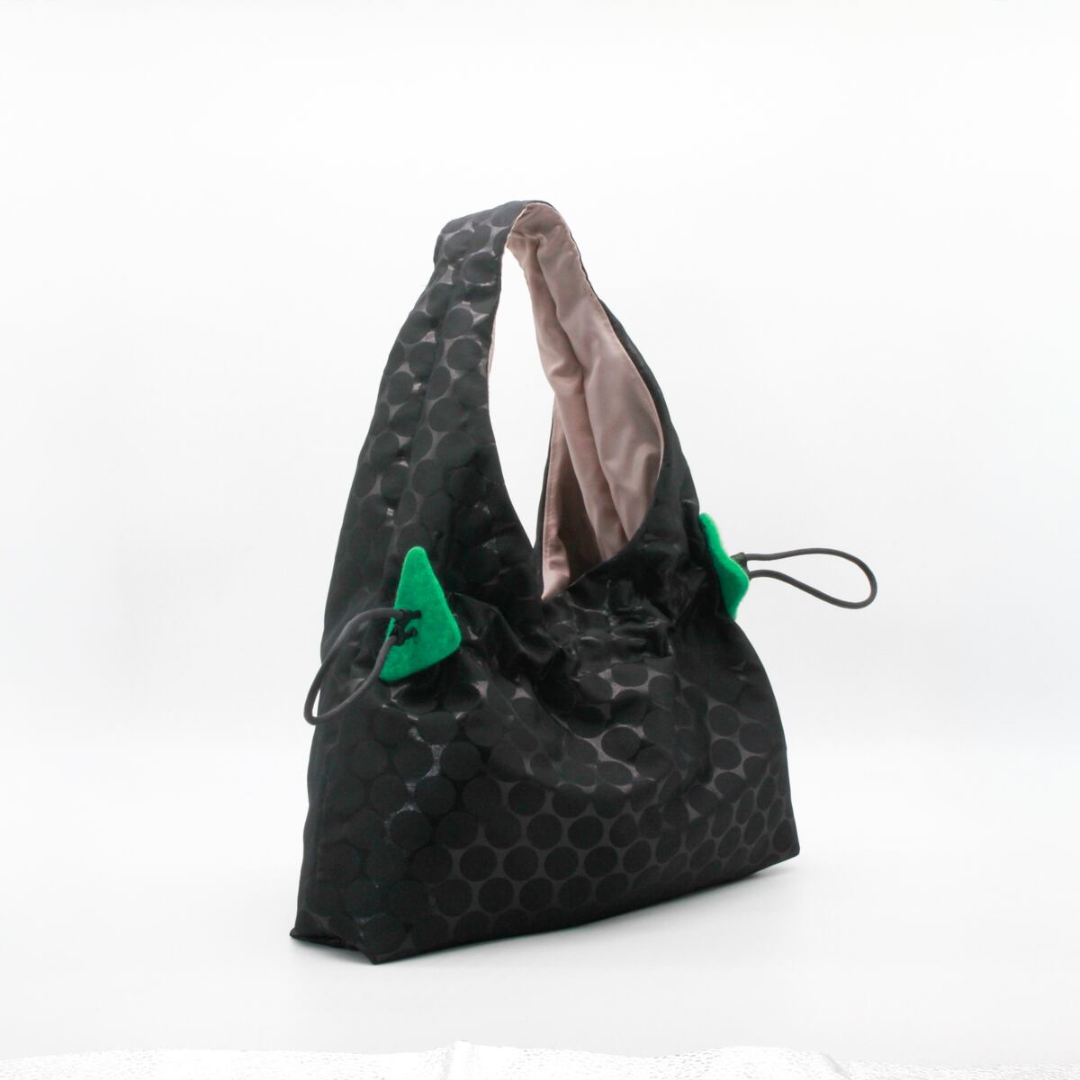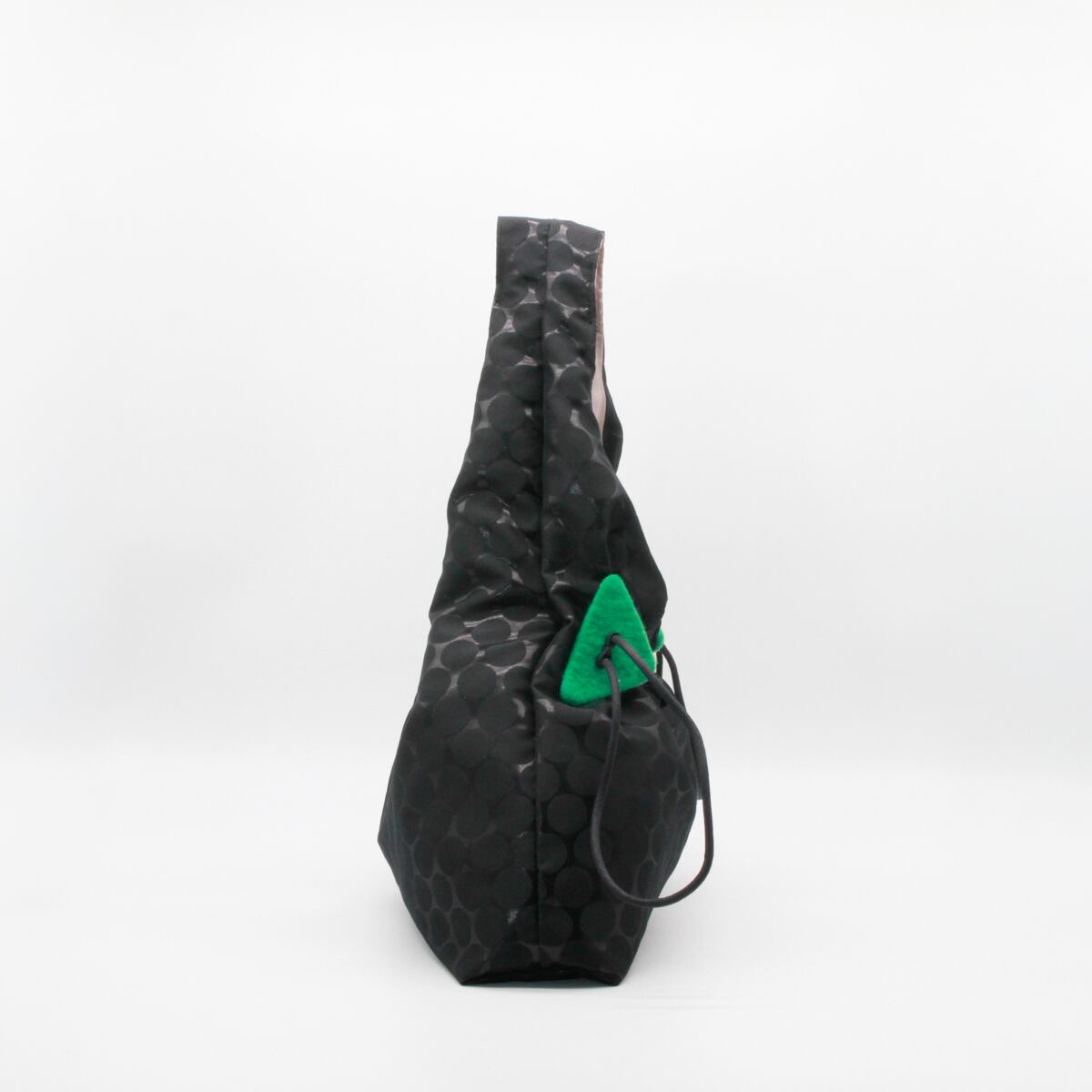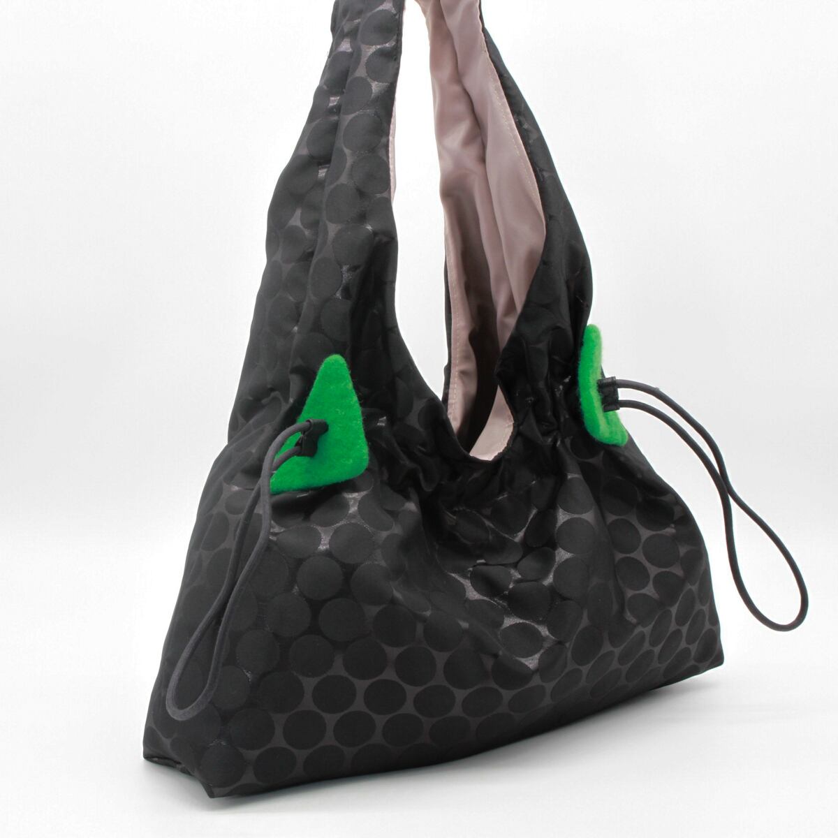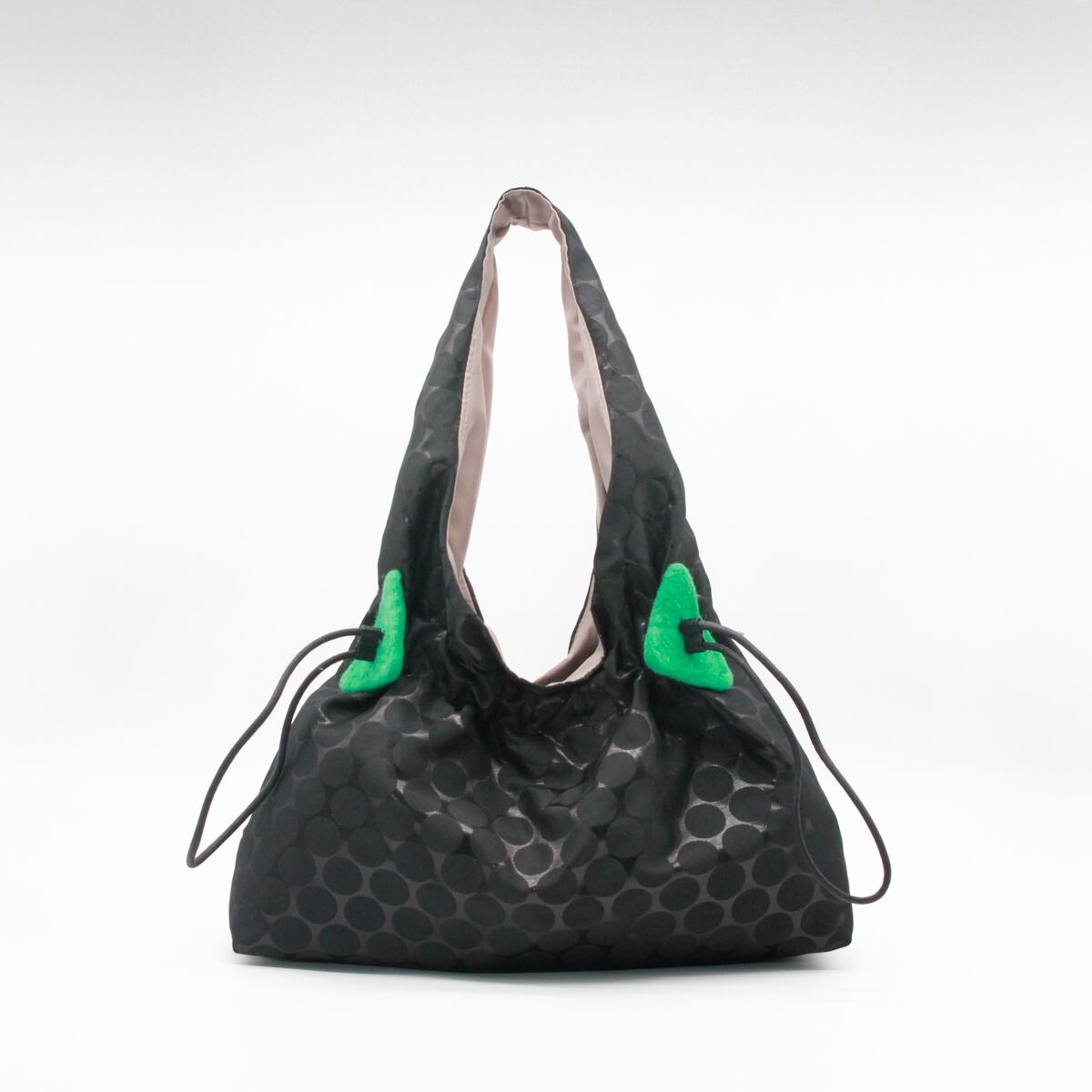 紐でギャザーを寄せることでフォルムの変化も楽しめ、その日のコーディネートや気分に合わせて印象を変えられるのがポイント。さらに、紐部分には青・赤・緑のフェルト装飾をあしらい、さりげない遊び心とアクセントを添えています。