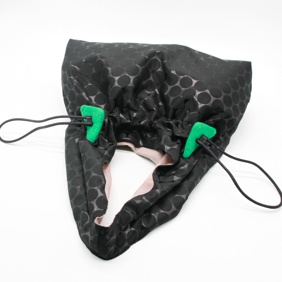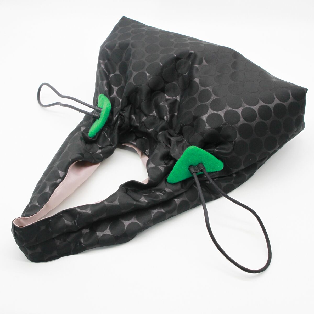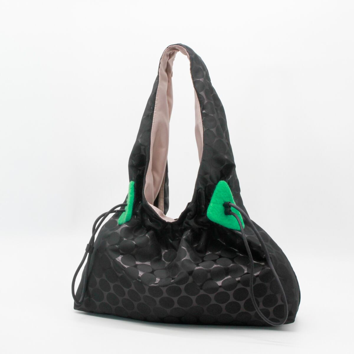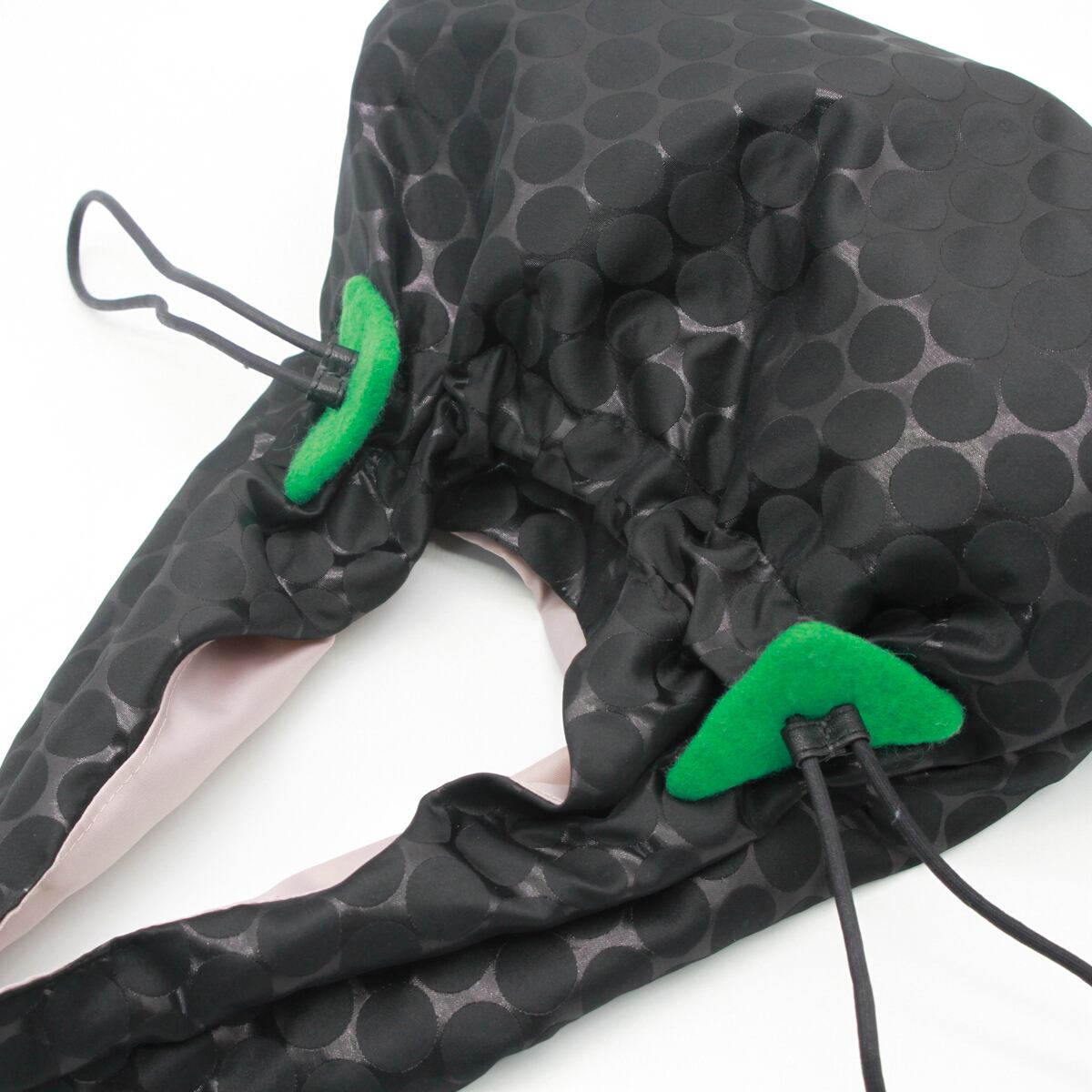 紐でギャザーを寄せることでフォルムの変化も楽しめ、その日のコーディネートや気分に合わせて印象を変えられるのがポイント。さらに、紐部分には青・赤・緑のフェルト装飾をあしらい、さりげない遊び心とアクセントを添えています。