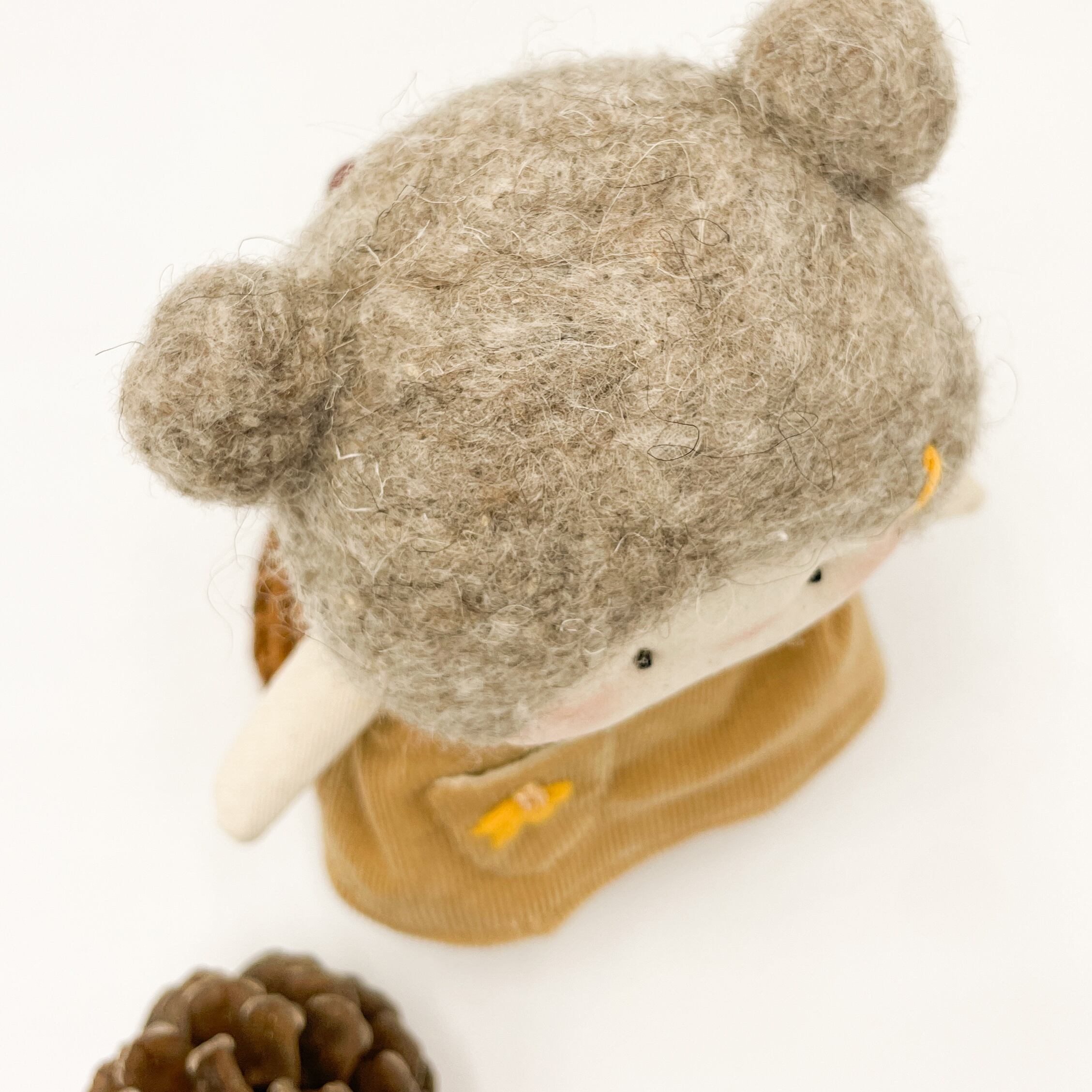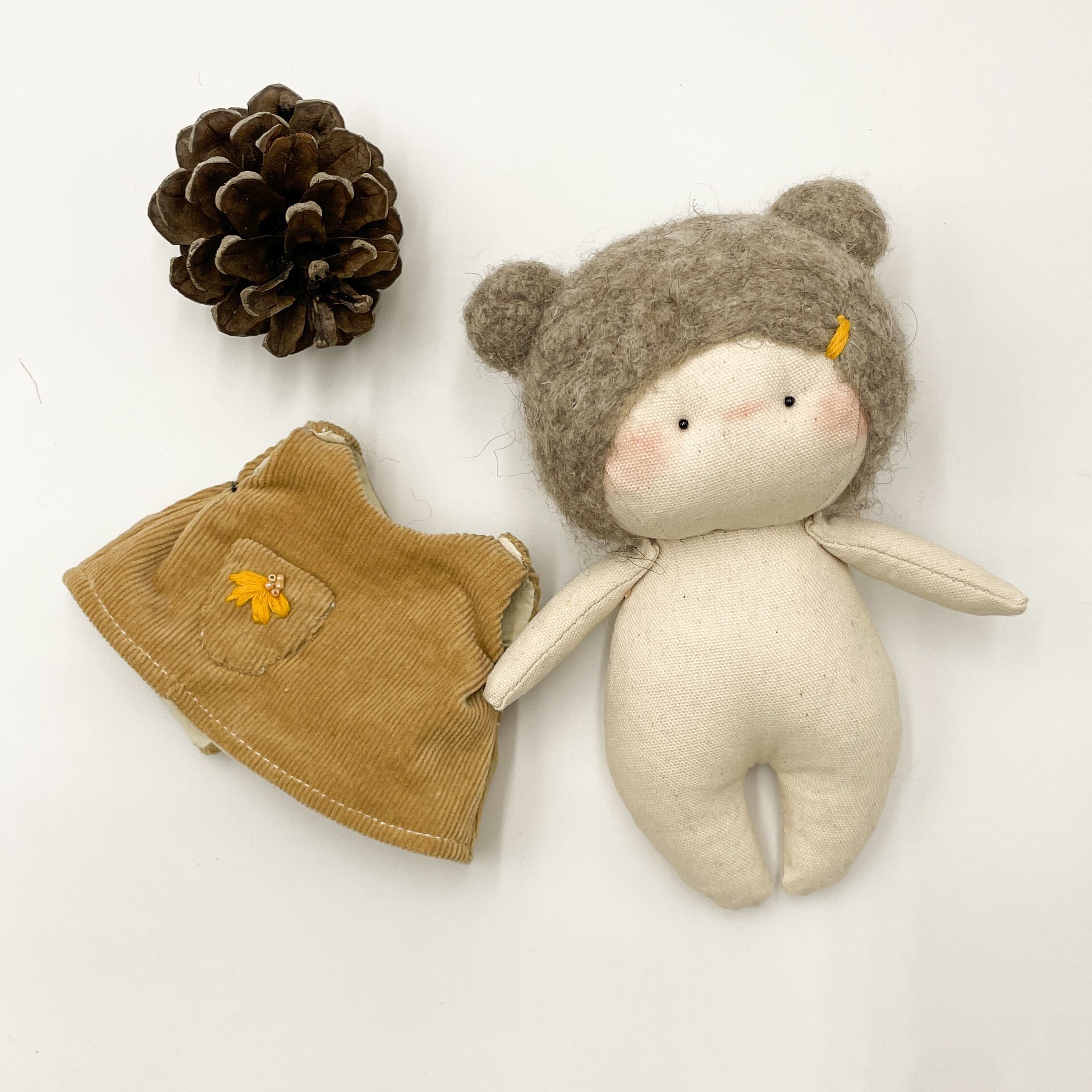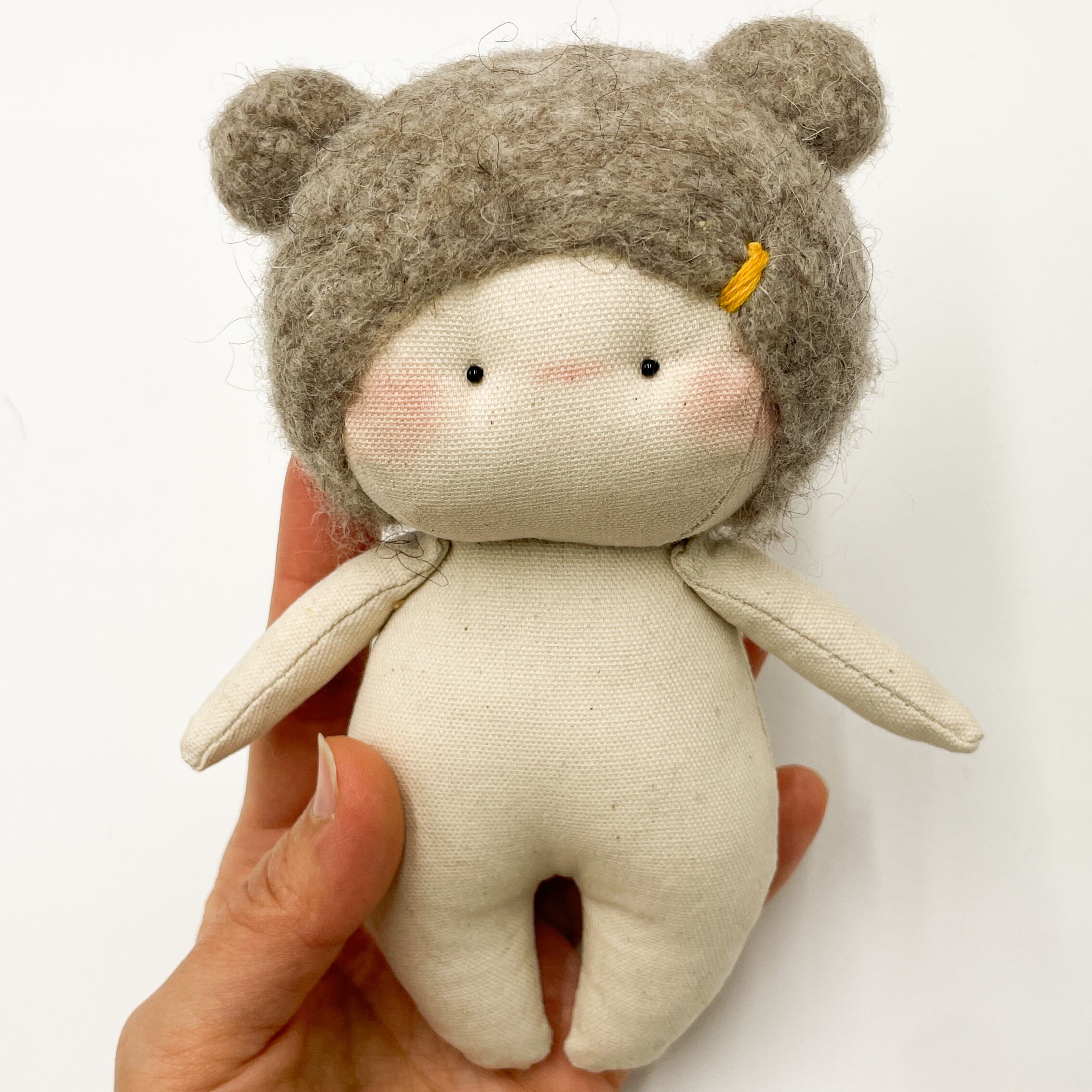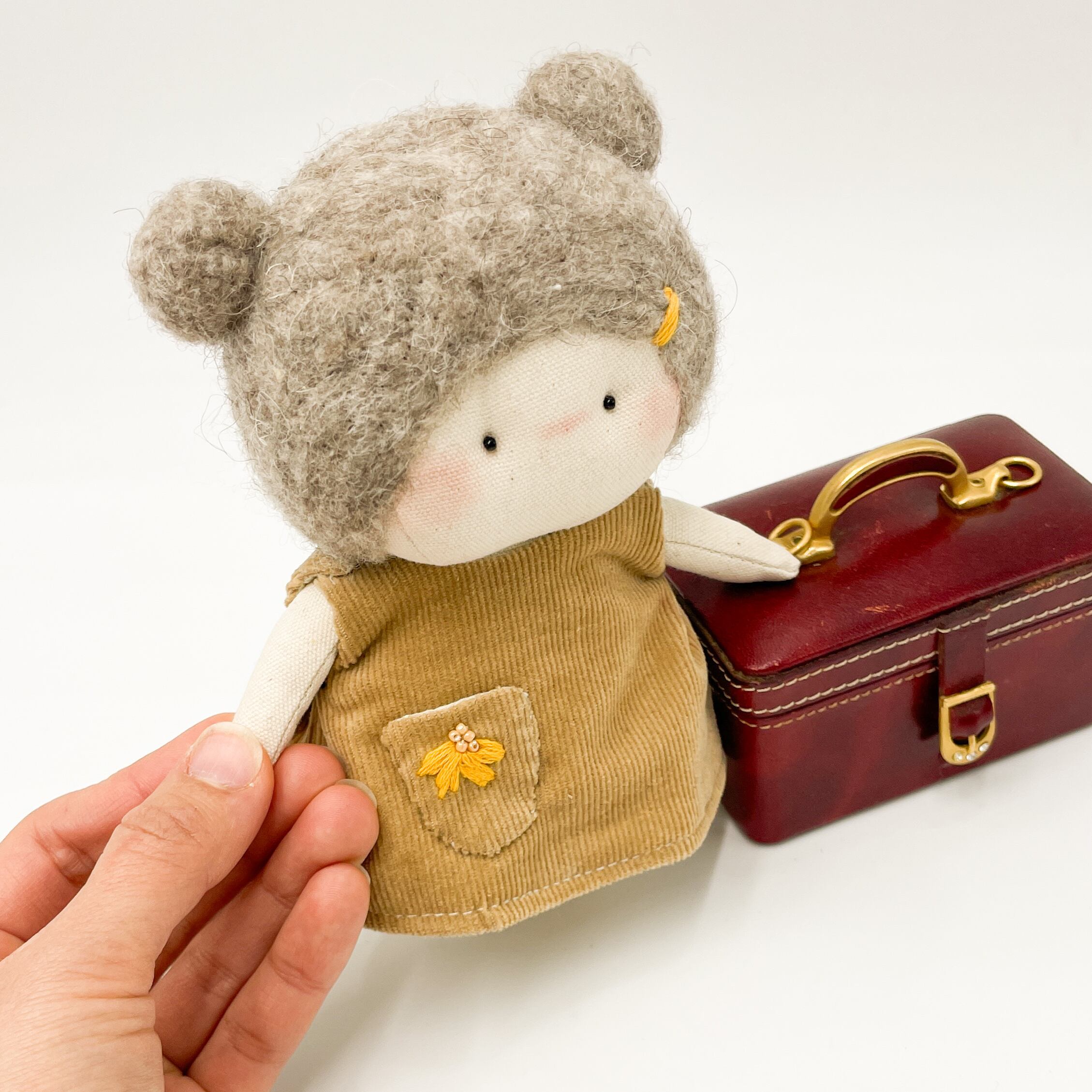 手のひらサイズでキュートなぬいぐるみが登場しました!100%ハンドメイドのミニぬいぐるみで、愛らしいくまさん耳が特徴です。ふわふわのフェルトヘアと、手縫いのデザイン刺繍がドレスに施されていて、とってもキュートなんですよ。
