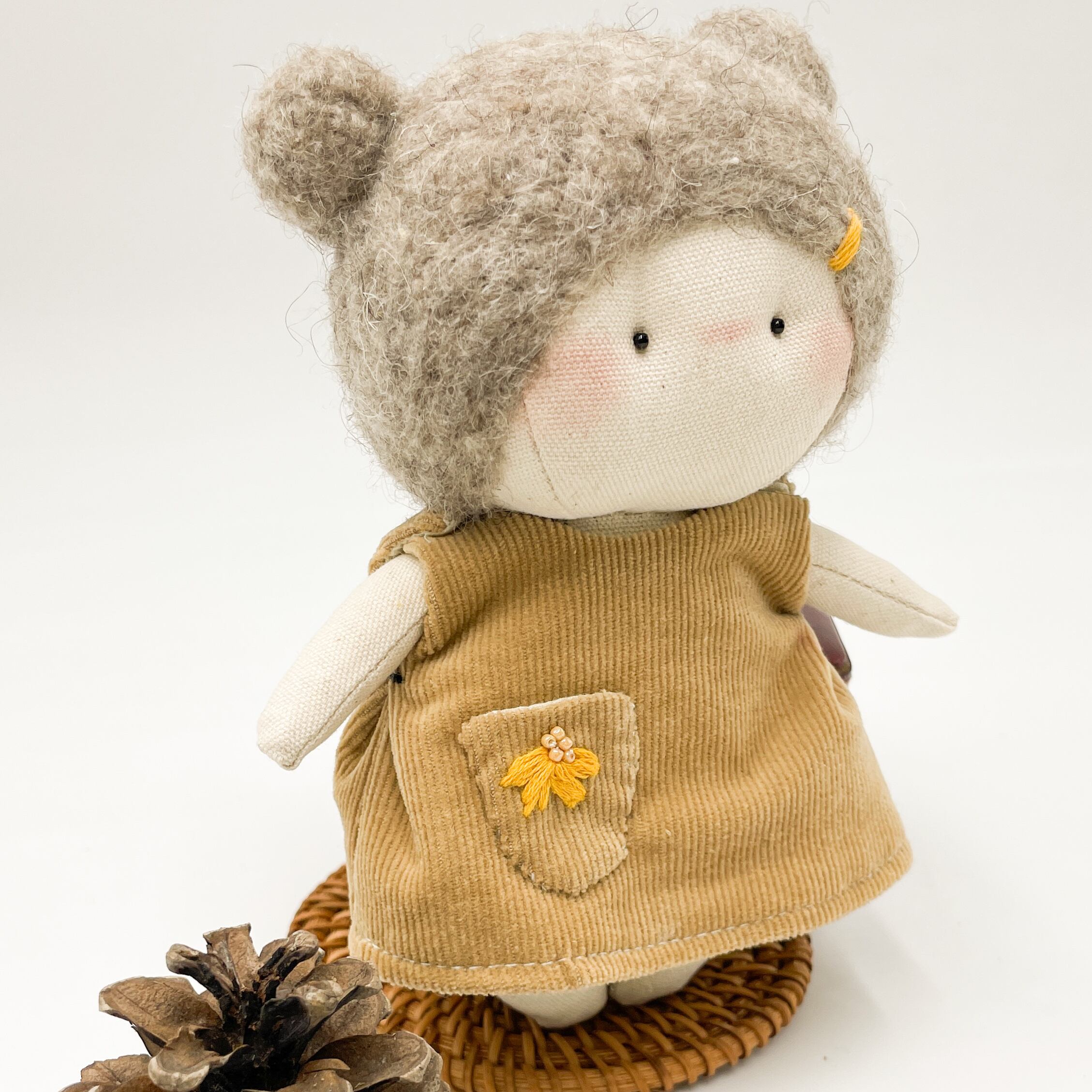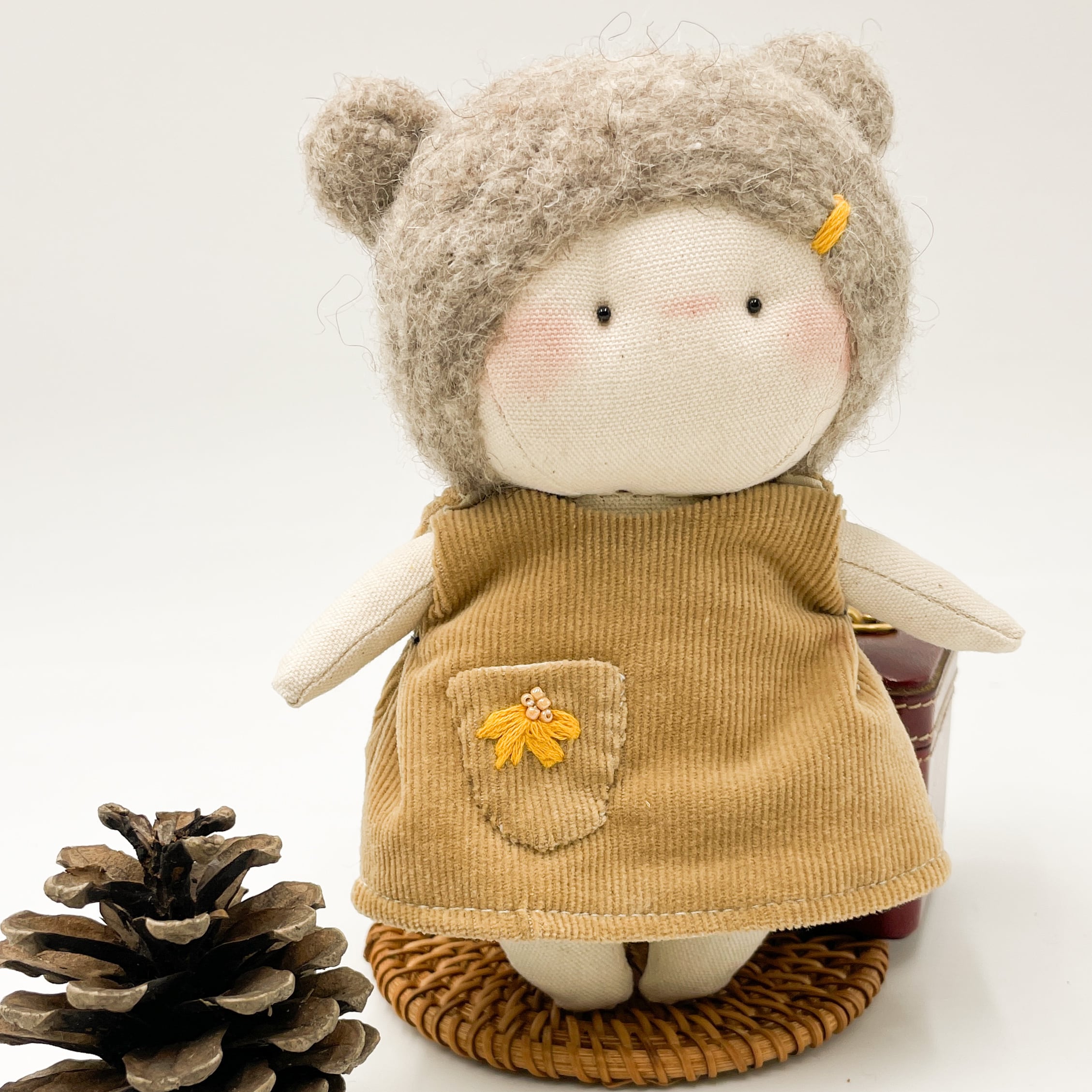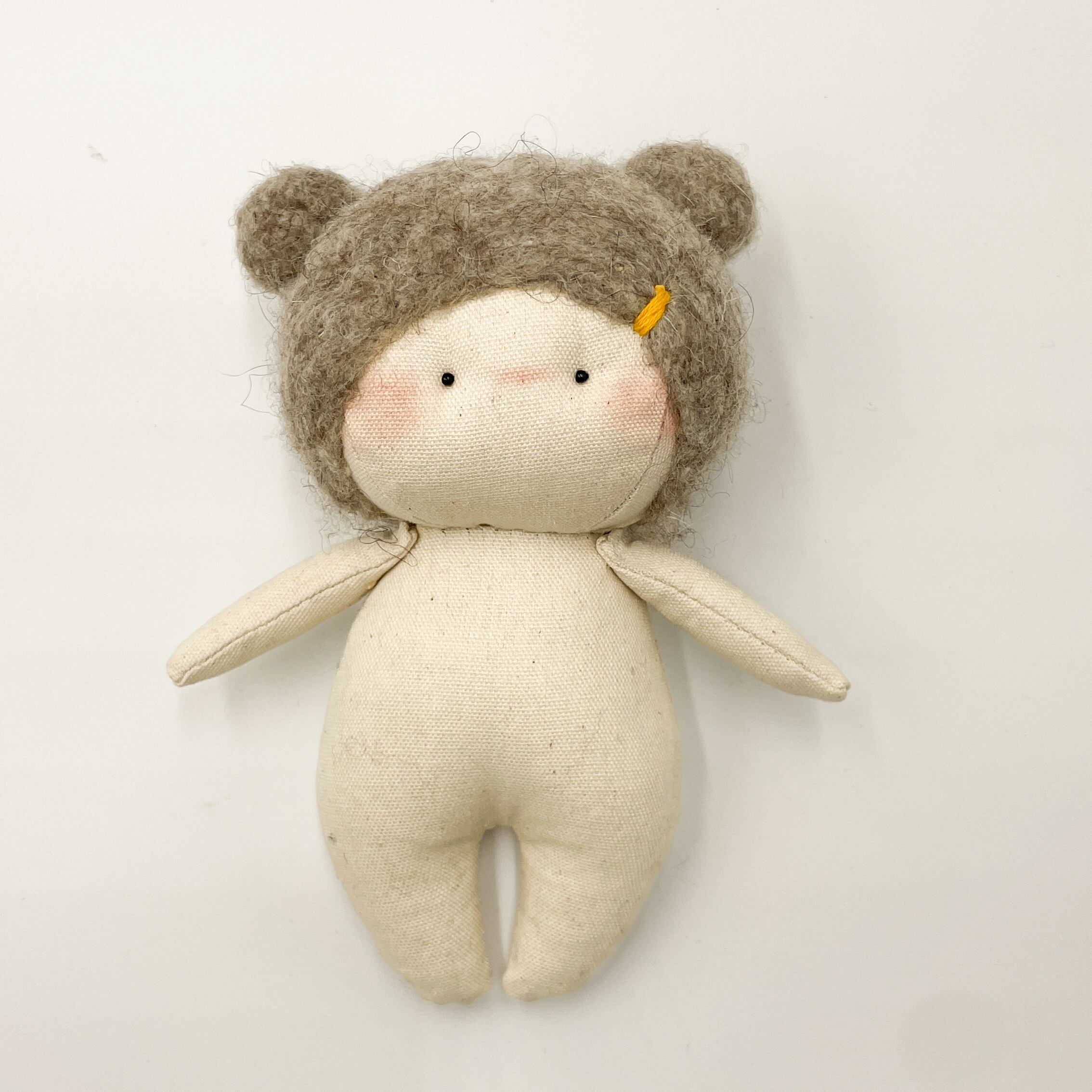 手のひらサイズでキュートなぬいぐるみが登場しました!100%ハンドメイドのミニぬいぐるみで、愛らしいくまさん耳が特徴です。ふわふわのフェルトヘアと、手縫いのデザイン刺繍がドレスに施されていて、とってもキュートなんですよ。