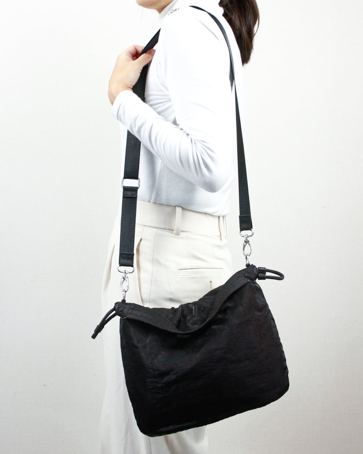 シャイニーな巾着2WAYショルダーバッグが登場!オフホワイトとシルバーのグリッター素材が、上品な輝きを放ちます。軽やかな手提げと斜めがけのスタイルが楽しめるので、1つ持っているだけでコーディネートの幅が広がります。さらに、巾着の調整によって形が変わるので、自分流のアレンジも楽しめます。 こちらの巾着2WAYショルダーバッグは、日本の伝統的な巾着をモダンにアレンジしたデザインです。お出かけやイベントでのお供にぴったりなアイテムです。シンプルな服装に差し色として取り入れるのもおすすめです。 新しい出会いや大切な瞬間を閉じ込めて、光輝く日々を彩ってください。自分だけのお気に入りバッグとして、ぜひお手元にしてください。